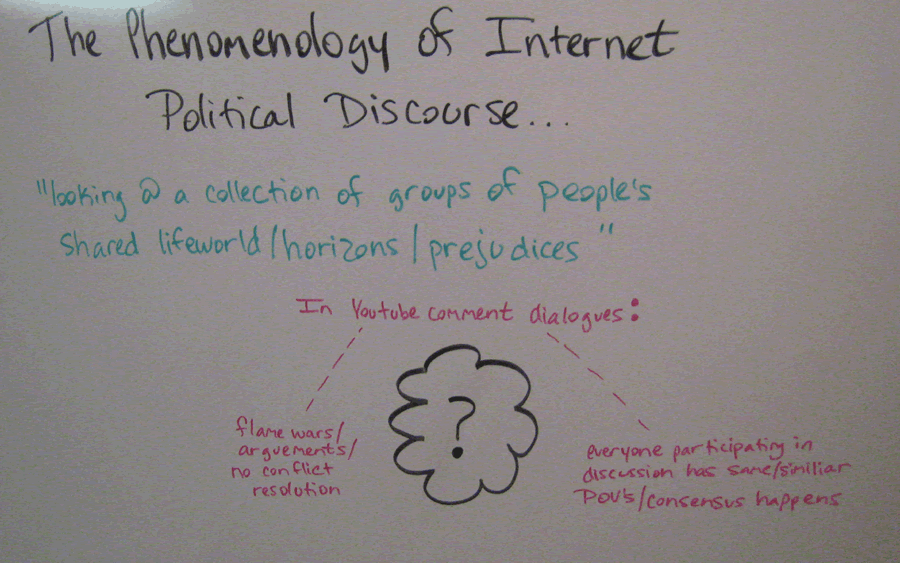 My experience was pretty similar to Mike’s as he described in the previous post. I did a lot of whiteboard work as well as a short analysis of the thing I was looking at (youtube comment dialogues for political discourse). I finished the assignment up with a document with prose, putting all of my ideas into somewhat coherent thoughts…