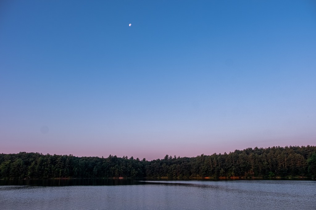 Slowly the sun displaces the moon over Walden Pond, July 2023.
