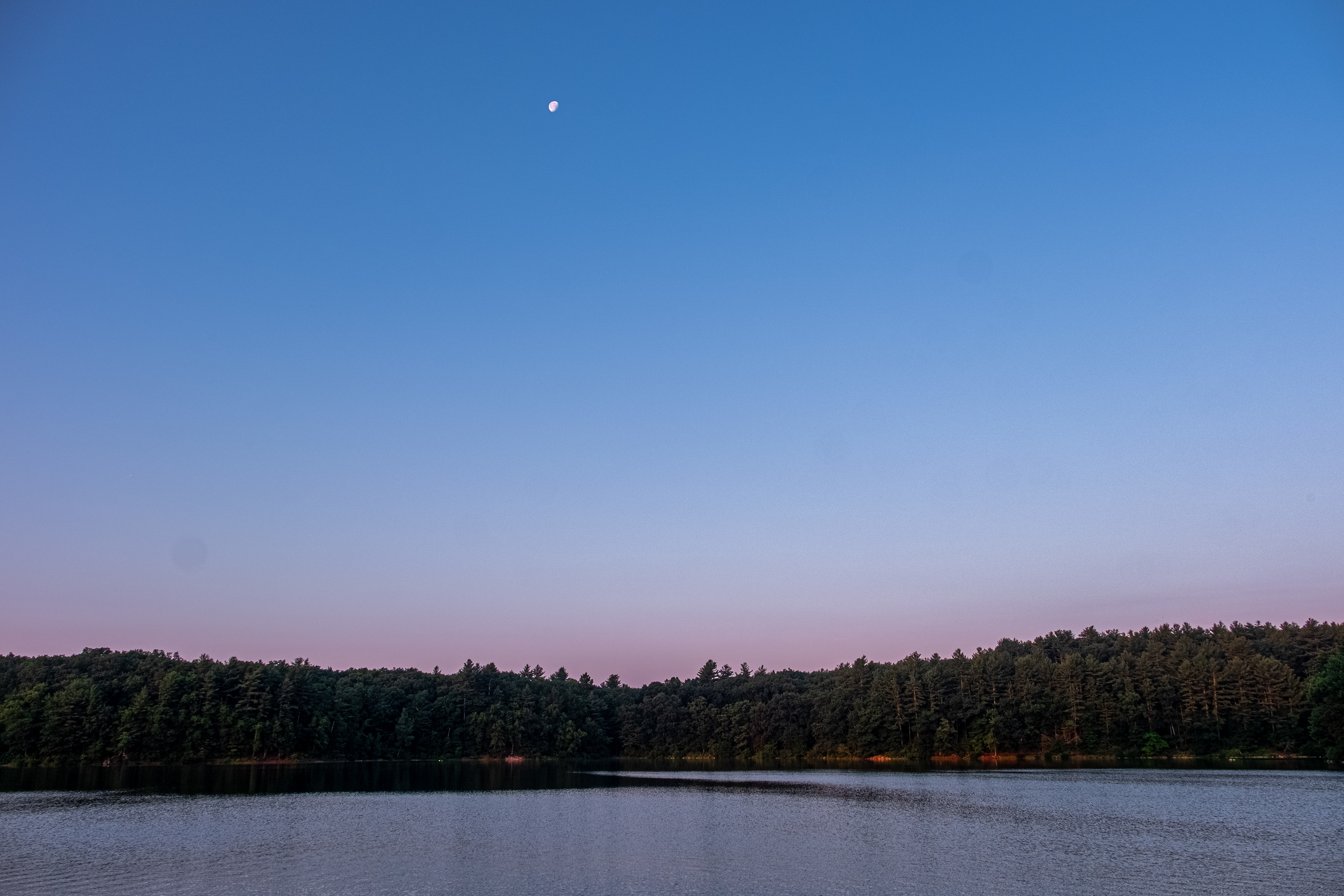 Slowly the sun displaces the moon over Walden Pond, July 2023.
